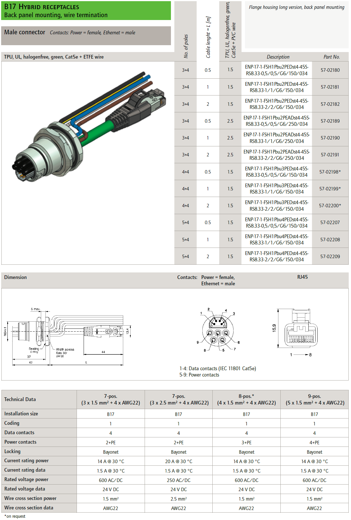 57-02208 ENP-17-1-FSH1Pbu4PEDst4-45SRS8.33-1/1/G6/150/034 B17 Hybrid receptacles back panel mounting, wire termination, long version, power female, ethernet male, poles 5+4, sez. pwr 1,5mmq, 22AWG, cable TPU, UL, halogenfree, green, Cat5e + ETFE wire, L=1m