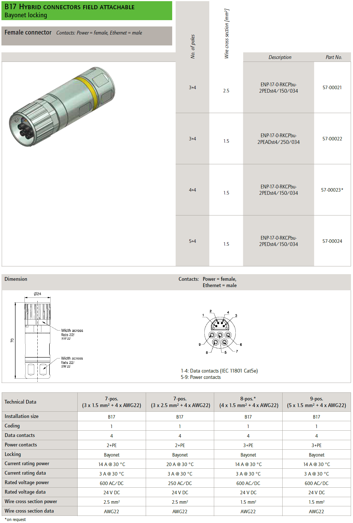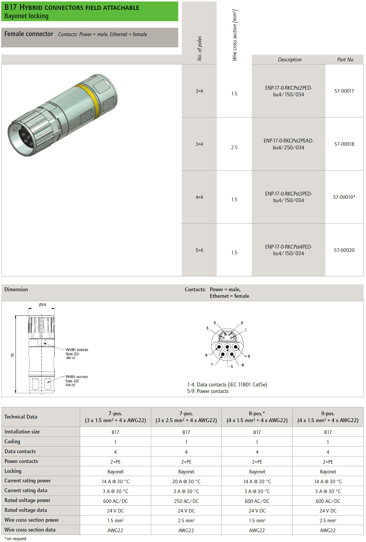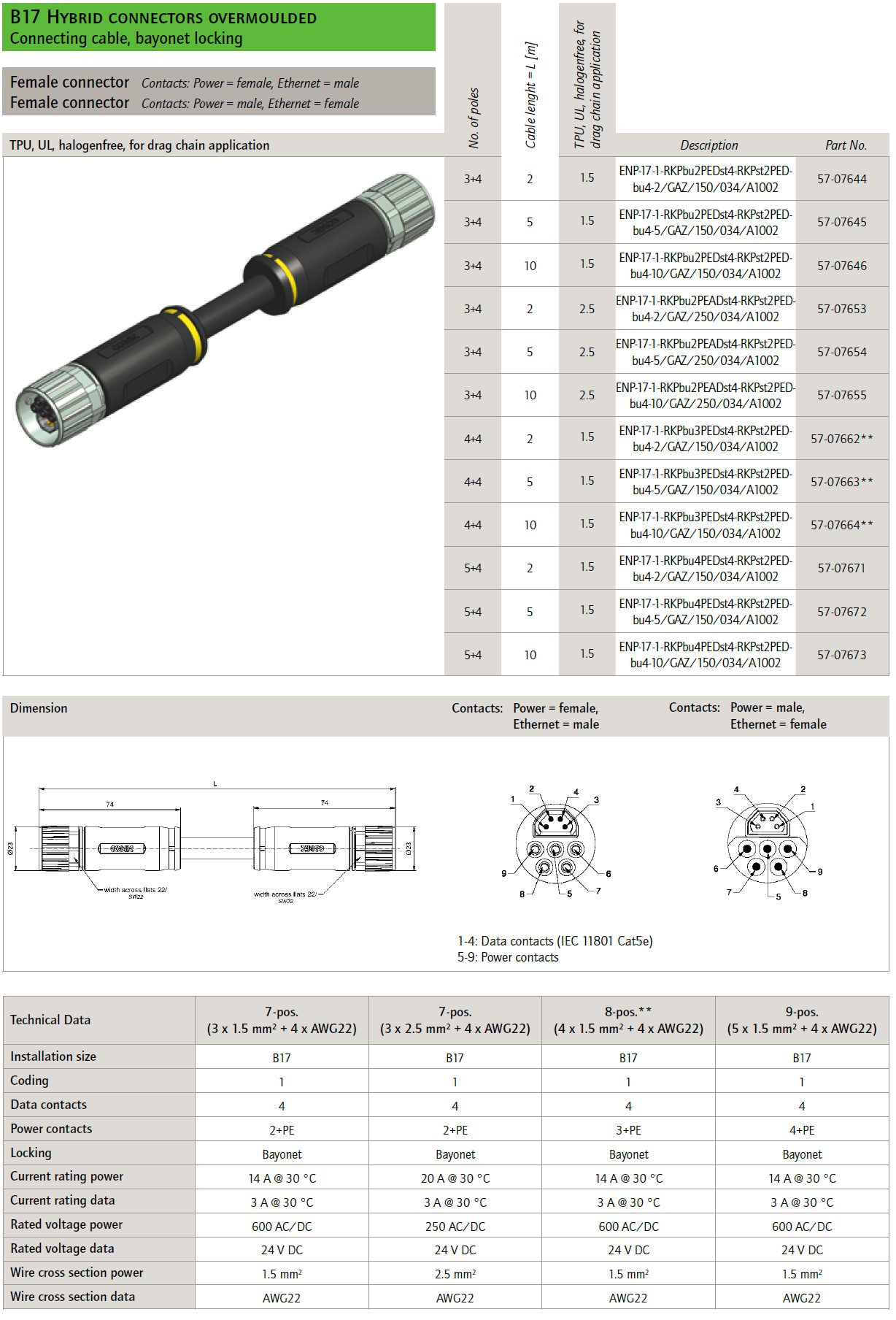 57-02387 ENP-17-1-FSH2Pst4PEDbu4-45SRS8.33-0,5/0,5/G6/150/034 B17 Hybrid receptacles back panel mounting, wire termination, short version, power male, ethernet female, poles 5+4, sez. pwr 1,5mmq, 22AWG, cable TPU, UL, halogenfree, green, Cat5e + ETFE wire, L=0,5m