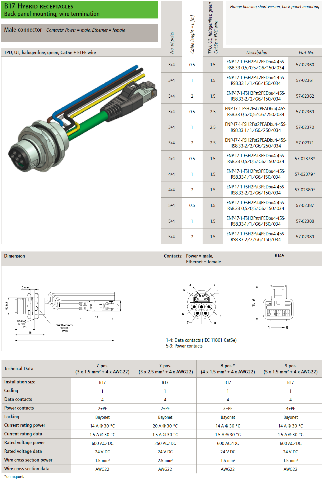 57-02380 ENP-17-1-FSH2Pst3PEDbu4-45SRS8.33-2/2/G6/150/034 B17 Hybrid receptacles back panel mounting, wire termination, short version, power male, ethernet female, poles 4+4, sez. pwr 1,5mmq, 22AWG, cable TPU, UL, halogenfree, green, Cat5e + ETFE wire, L=2m