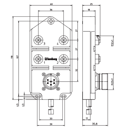 0911 ANC 002 – AS-Interface passive module to connect 4 AS-Interface sensors, AS-Interface actuators or ASInterface round cable modules, 4 ports, combined M12 socket with connection for AS-Interface standard round cables and on-board M23 connection for aux power, Plastic, 60 mm