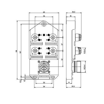 ASBSV 4/LED 5 – Pluggable actuator/sensor distribution box with LED operation and function indicators, 4-ports, top-entry, M12 sockets, 5-poles, 2 signals per socket, with M23 quick-disconnect for the control cable. Control cable type: 19P: RKU 19-242/…M or RKWU 19-242/…M. Plastic, 60 mm