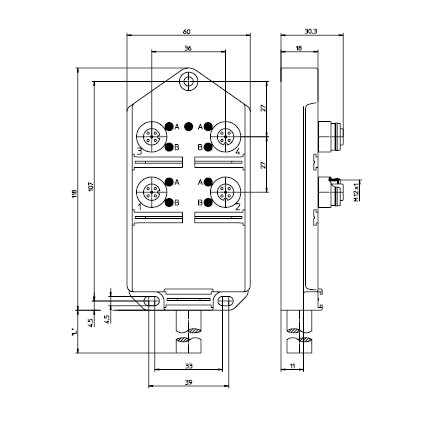 ASBV 4/LED 5-256/…M – Actuator/sensor distribution box with LED operation and function indicators, top-entry, 4-ports, M12 sockets, 5-poles, 2 signals per socket, with integrated control cable. Control cable is suitable for c-track applications. Plastic, 60 mm
