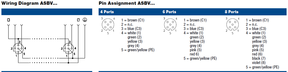 ASBV 6 5-332/…M – Actuator/sensor distribution box, top-entry, 6-ports, M12 sockets, 5-poles, 2 signals per socket, with integrated control cable. Control cable is suitable for c-track applications. Plastic, 60 mm