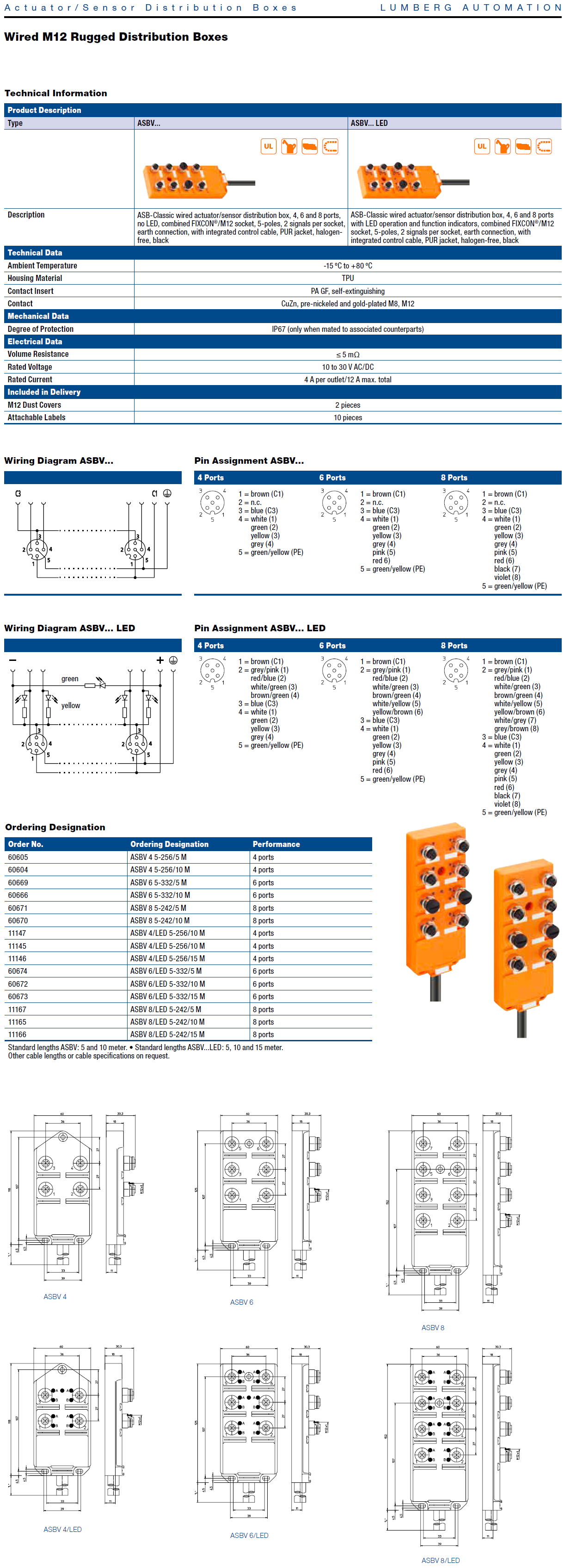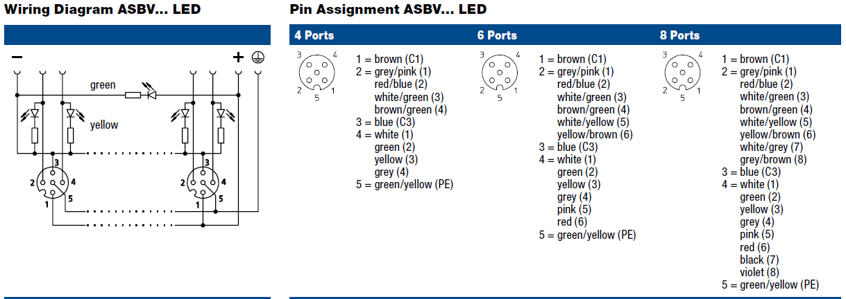 ASBV 8/LED 5-242/…M – Actuator/sensor distribution box with LED operation and function indicators, top-entry, 8-ports, M12 sockets, 5-poles, 2 signals per socket, with integrated control cable. Control cable is suitable for c-track applications. Plastic, 60 mm