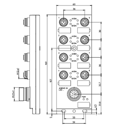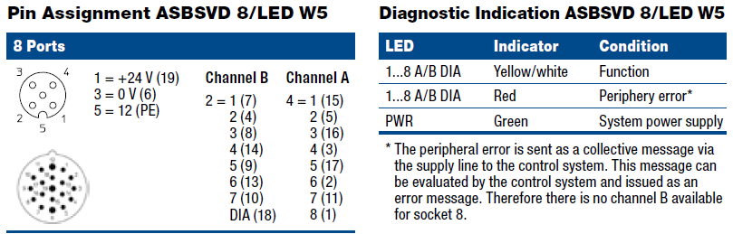 ASBSVD 8/LED W5 – Pluggable actuator/sensor distribution box with LED operation and function indicators, 8-ports with integrated fuses and diagnostics display, top-entry, M12 sockets, 5-poles with M23 quick-disconnect for the control cable. Control cable type: 19P: RKUF 19-242/…M or RKWUF 19-242/…M. Plastic, 60 mm