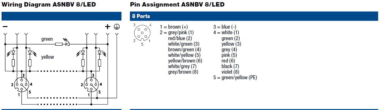 ASNBV 8/LED 5-278/…M – Actuator/sensor distribution box with LED operation and function indicators, housing and receptacle shells in staniless steel, top-entry, 8-ports, M12 sockets, 5-poles, 2 signals per socket, with integrated control cable. Especially designed for use in food processing equipment applications. Stainless Steel, 60 mm
