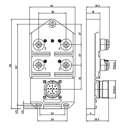 ASBS 4/LED 5-4 – Pluggable actuator/sensor distribution box with LED operation and function indicators, 4-ports, top-entry, M12 sockets, 4-poles, 1 signals per socket, with M23 quickdisconnect for the control cable. Control cable type: 12P: RKU 12-256/…M or RKWU 12-256/…M. Plastic, 60 mm