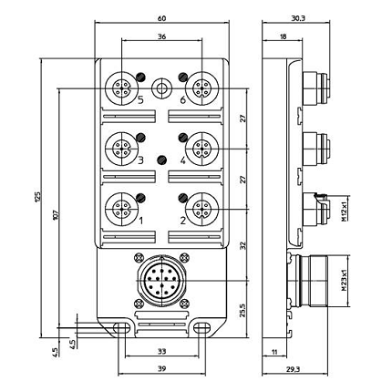 Distributore ASB-Classic 6 porte LED M12x1 segnale M23 collegamento Plastic 60 mm
