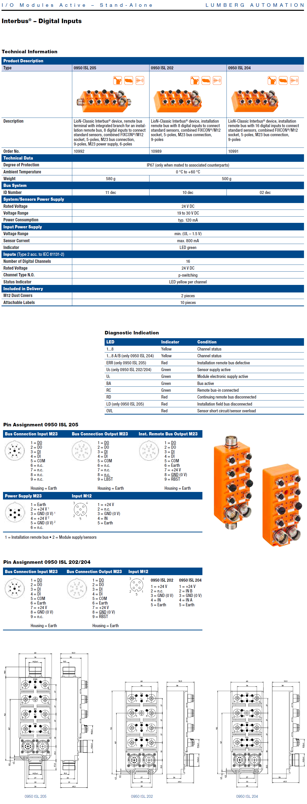 0950 ISL 202 – LioN-Classic, Interbus Installation Remote Bus terminal with 8 digital inputs (PNP) and M23 bus connectors. Features: Short circuit detection, protection degree IP67 / NEMA 6P, shock and vibration protected by using potting technology, Plastic, 60 mm