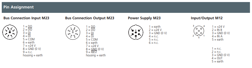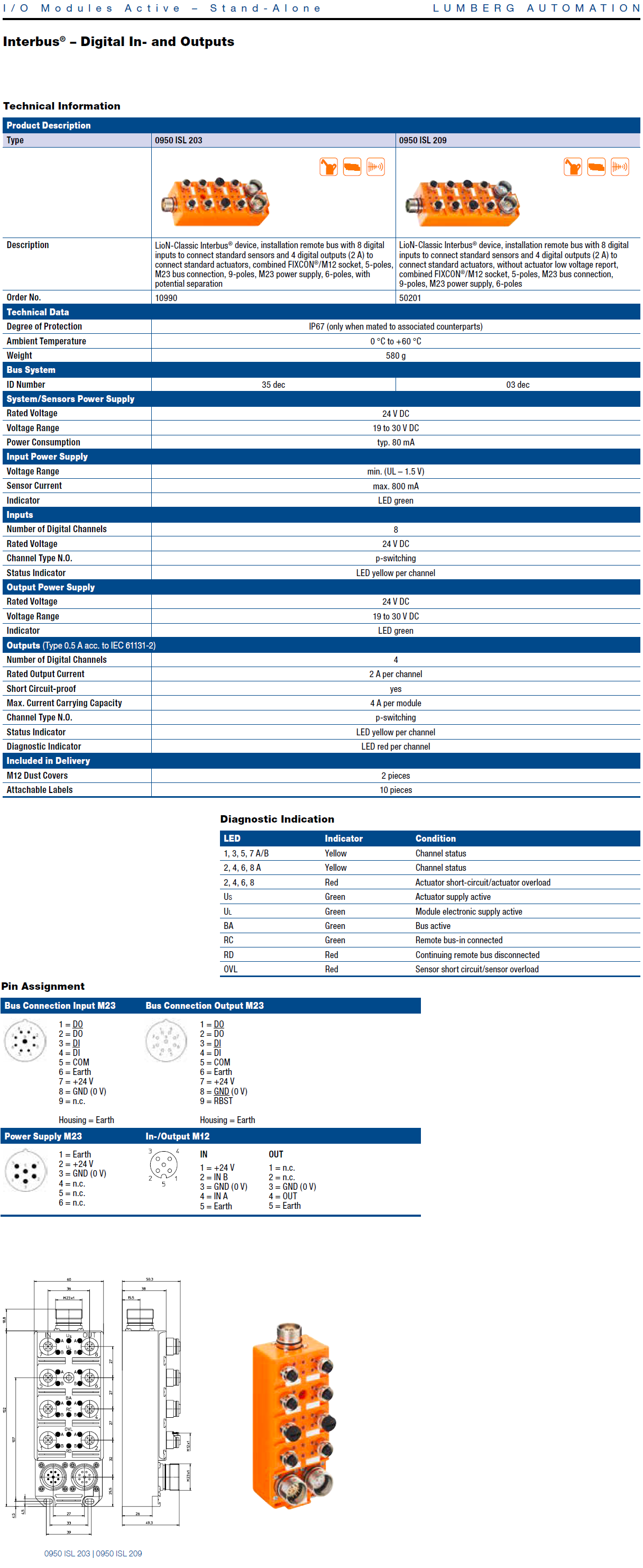 0950 ISL 209 – LioN-Classic, Interbus Installation Remote Bus terminal with 8 digital inputs (PNP), 4 digital outputs (2A) and M23 bus and power connectors without actuator power diagnostics. Features: Short circuit detection, protection degree IP67 / NEMA 6P, shock and vibration protected by using potting technology, Plastic, 60 mm