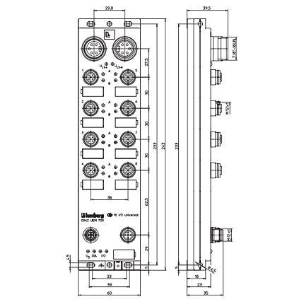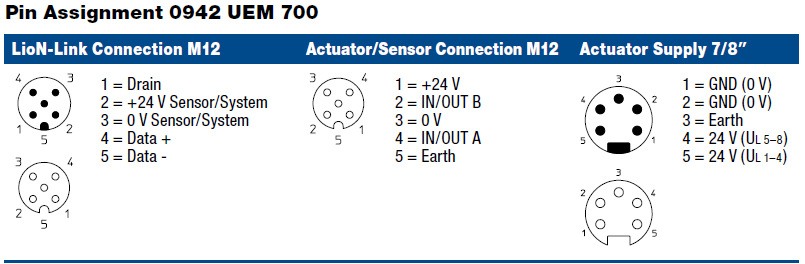 0942 UEM 700 – LioN-Link I/O module with 16 digital I/O channels, channels can be used universally as inputs or outputs, M12 sockets (8 x), 5 poles, 7/8” actuator supply, Plastic, 60 mm