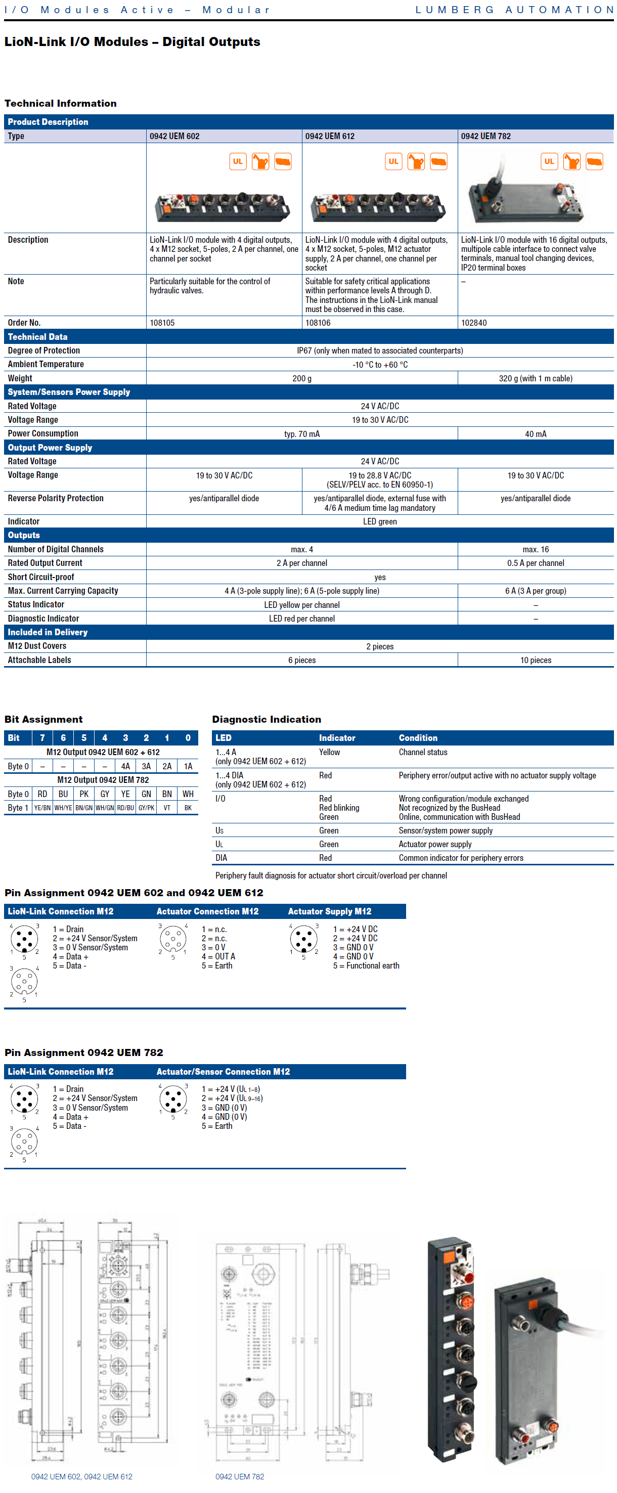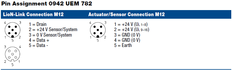 0942 UEM 782 – LioN-Link I/O module with 16 digital outputs, multipole cable interface to connect valve terminals, manual tool changing devices, IP20 terminal boxes, Plastic, 60 mm