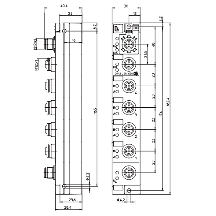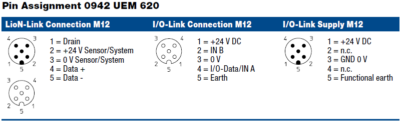 0942 UEM 620 – LioN-Link I/O module with 4 I/O-Link channels, each channel can be configured universally in standard digital I/O mode (SIO mode) or in communications mode, M12 sockets, 4 poles. Only with BusHead 0940 PSL 602 or ProfiNet BusHead 0940 ESL 601, Plastic, 30 mm