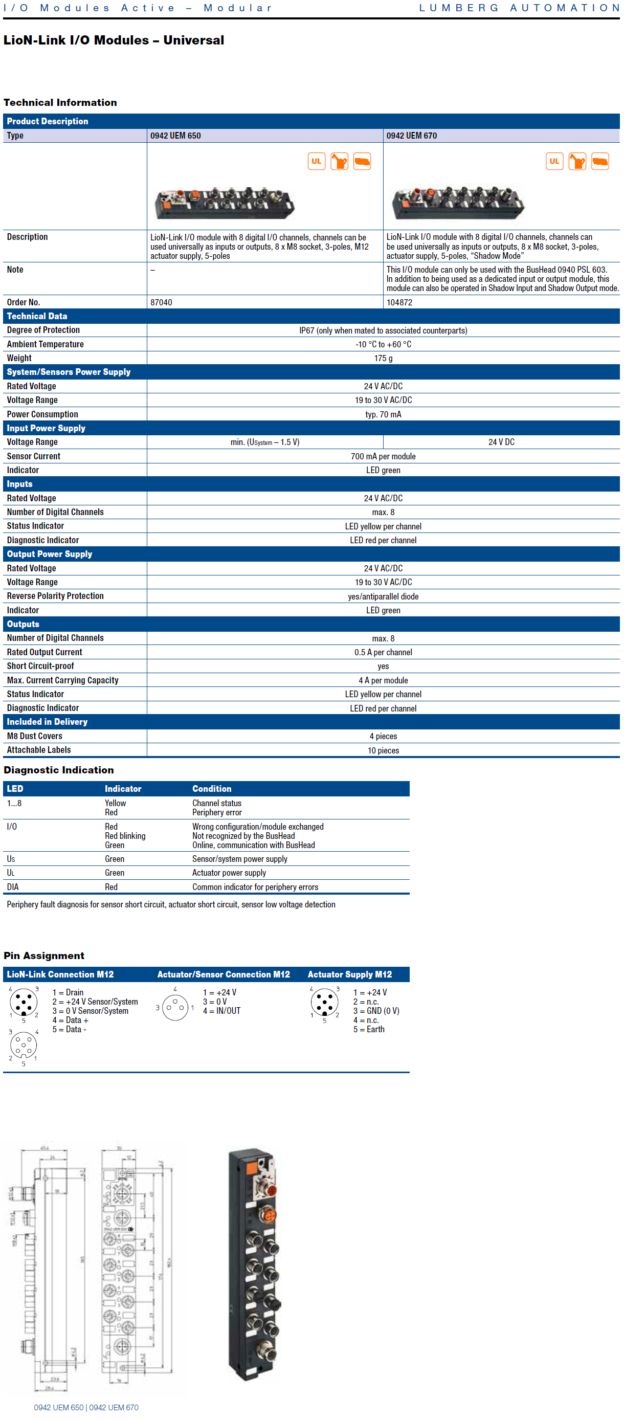 0942 UEM 670 – LioN-Link I/ O module with 8 digital I/O channels, channels can be used universally as inputs or outputs, M8 sockets, 3 poles Input or output functionality can be switched off while retaining the respective address range (Only with 0940 PSL 603), Plastic, 30 mm