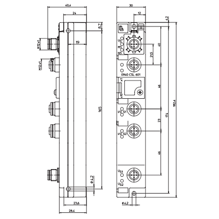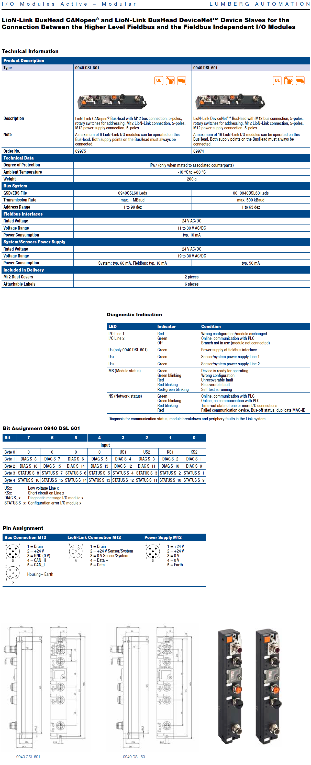 0940 CSL 601 – LioN-Link BusHead IP 67 bus coupler module for the connection between the higher level fieldbus and the fieldbus independent I/O modules, with M12 bus connection, rotary switches for addressing, M12 LioN-Link connection, M12 power supply connection, Plastic, 30 mm