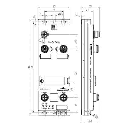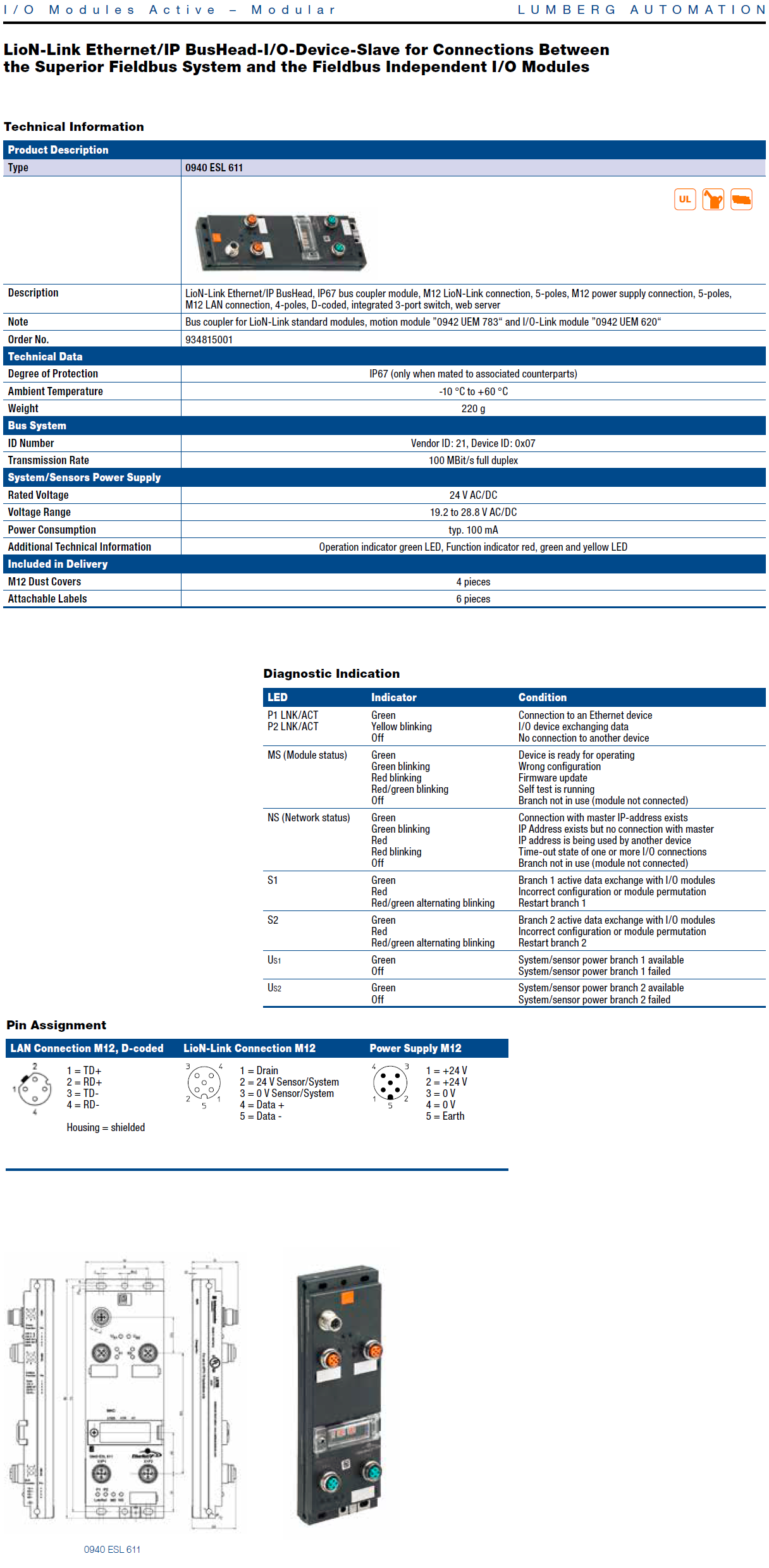 0940 ESL 611 – LioN-Link EtherNet/IP Bus Coupler module provides the connections between the entire fieldbus system and the fieldbus independent I/O modules, optimizing the field wiring through the utilization of a modular, decentralized IP 67 fieldbus solution, Plastic, 60 mm