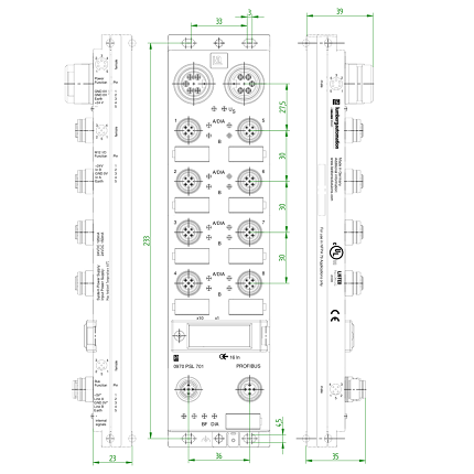 0970 PSL 701 – LioN-M, PROFIBUS I/O Device, 16DI (8x M12), 7/8″ Power Supply, Plastic, 60 mm