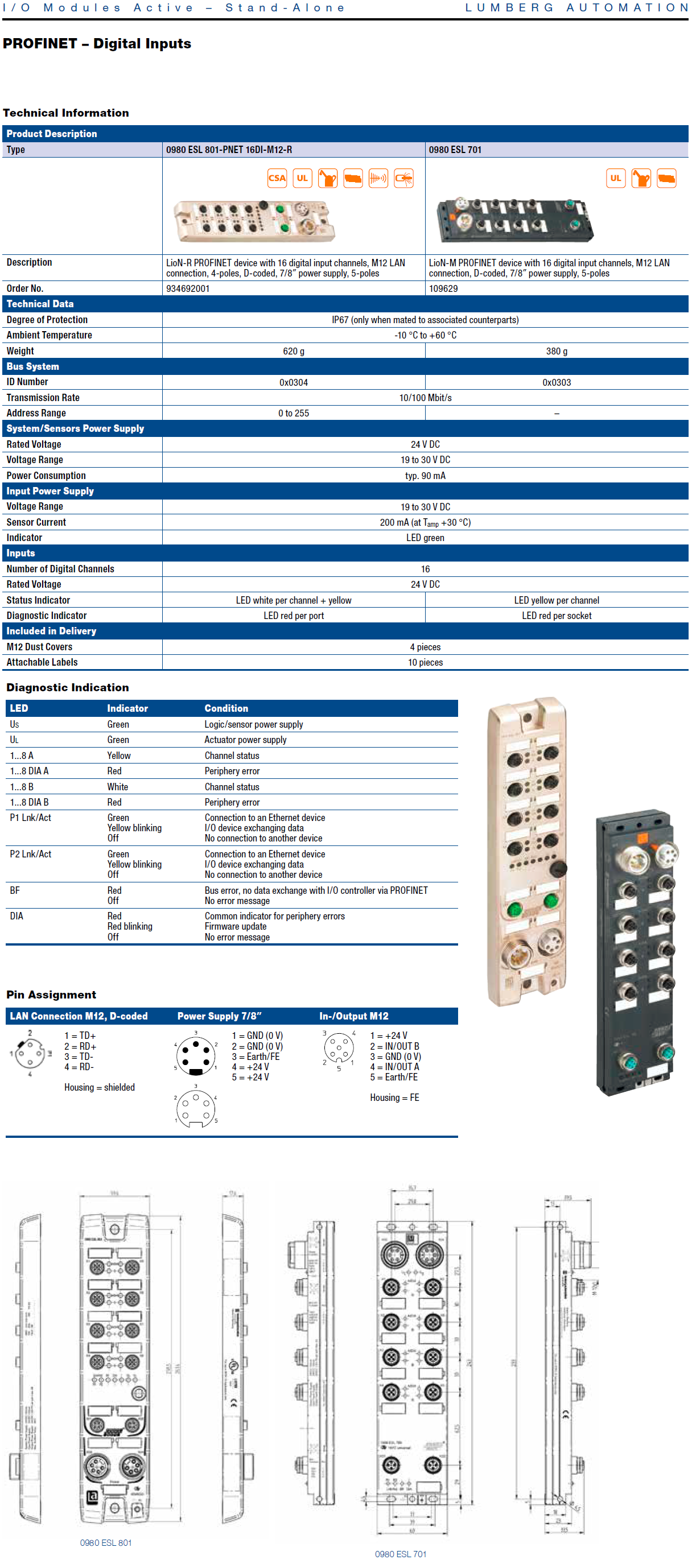0980 ESL 701 – LioN-M, PROFINET I/O Device, 16DI (8x M12), 7/8″ Power Supply, Plastic, 60 mm
