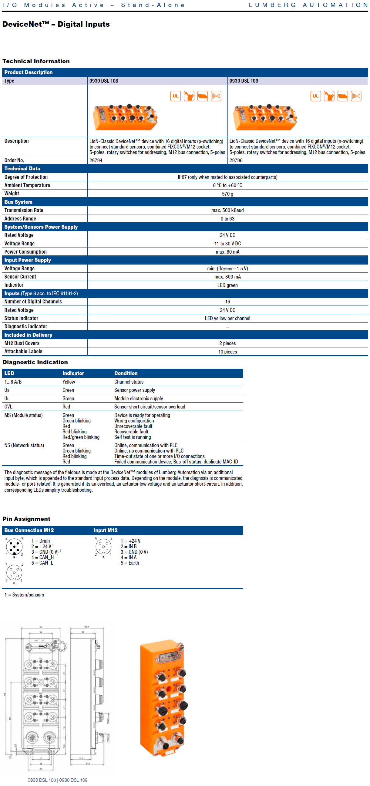 0930 DSL 108 – LioN-M, DeviceNet device with16 digital inputs (p-switching) to connect standard sensors, M12 socket, rotary switches for addressing, M12 bus connection, Plastic, 60 mm