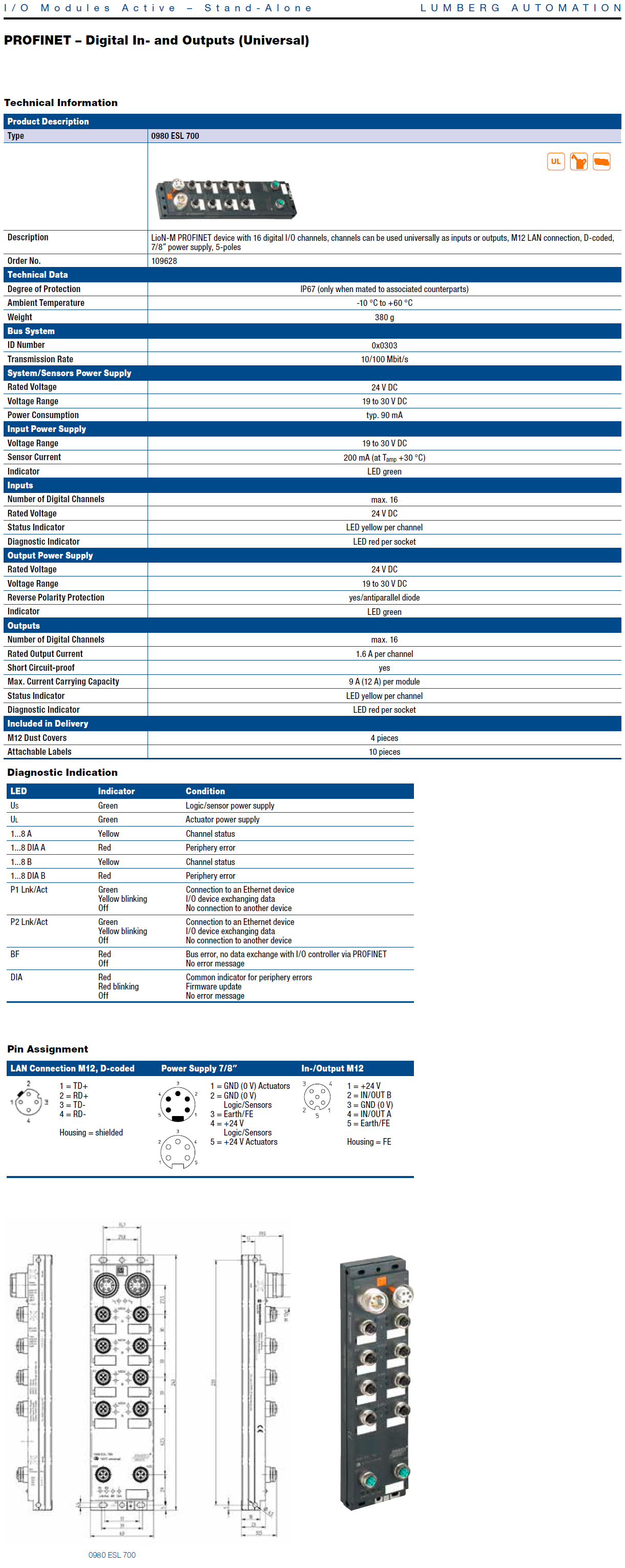 0980 ESL 700 – LioN-M, PROFINET I/O Device, 16DIO (8x M12), 7/8″ Power Supply, Plastic, 60 mm