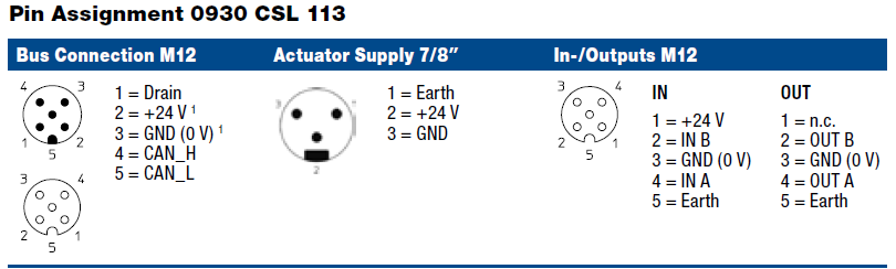 0930 CSL 113 – LioN-M, CANopen device with 8 digital inputs to connect standard sensors and 8 digital outputs (0.5 A) to connect standard actuators, combined FIXCON/M12 socket, rotary address switches for addressing, M12 bus connection, 7/8″ actuator supply, Plastic, 60 mm