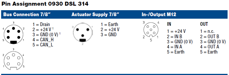 0930 DSL 314 – LioN-M, DeviceNet device with 8 digital inputs to connect standard sensors and 8 digital outputs (0.5 A) to connect standard actuators, combined M12 socket, rotary switches for addressing, 7/8” bus connection, 7/8“ actuator supply, Plastic, 60 mm