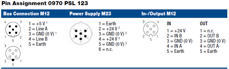0970 PSL 123 – LioN-M Profibus-DP device with 8 digital inputs to connect standard sensors and 8 digital outputs (0.5 A) to connect standard actuators, combined M12 socket, rotary switches for addressing, M12 bus connection, M23 systems/actuator supply, Plastic, 60 mm