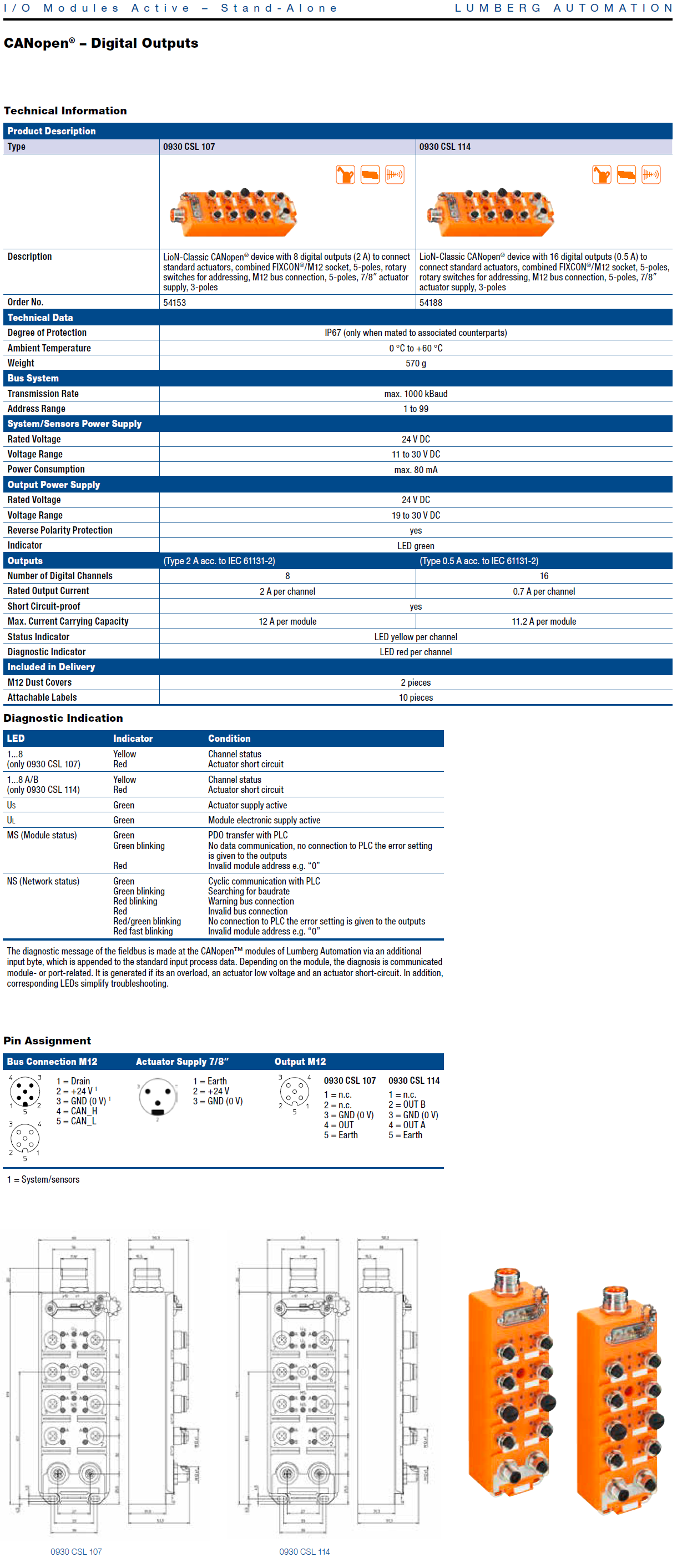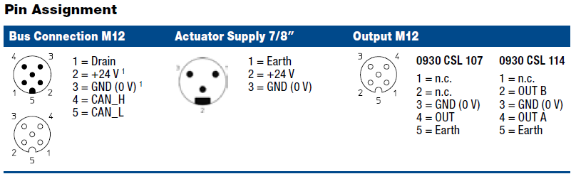 0930 CSL 107 – LioN-M, CANopen device with 8 digital outputs (2 A) to connect standard actuators, combined FIXCON/M12 socket, rotary address switches for addressing, M12 bus connection, 7/8″ actuator supply, Plastic, 60 mm