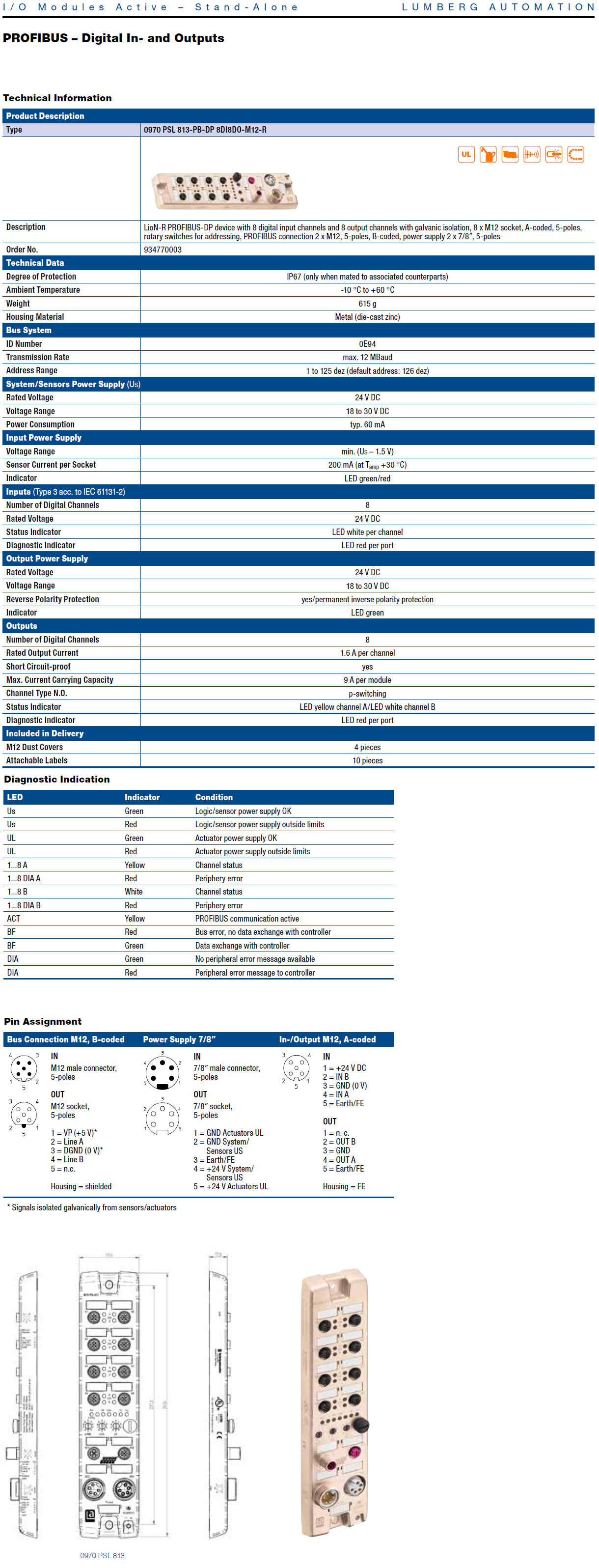 0970 PSL 813-PB-DP 8DI8DO-M12-R – LioN-R PROFIBUS-DP module with 8 digital input and 8 digital output channels, galvanically isolated, 8 x M12 sockets, A-coded, 5 poles, rotary switch for setting addresses, PROFIBUS connection, 2 x M12, 5 poles, B-coded, 2 x 7/8“ power supply, 5 poles, Metal, 60 mm