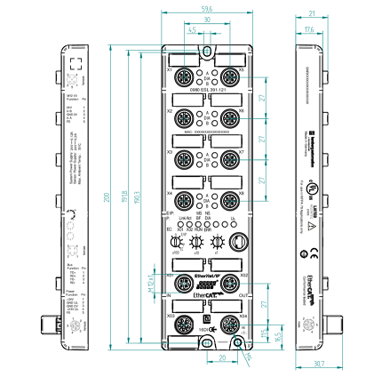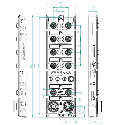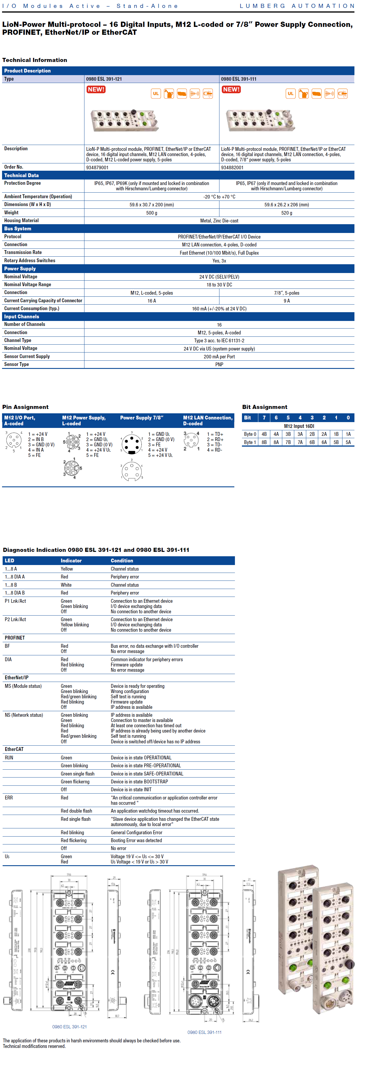 0980 ESL 391-111 LioN-P, Multiprotocol I/O Device, 16DI (8x M12), 7/8″ Power Supply, Metal, 60 mm