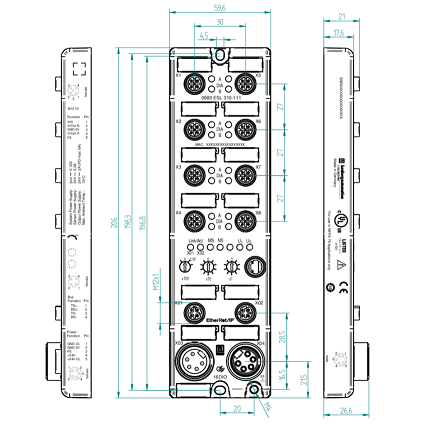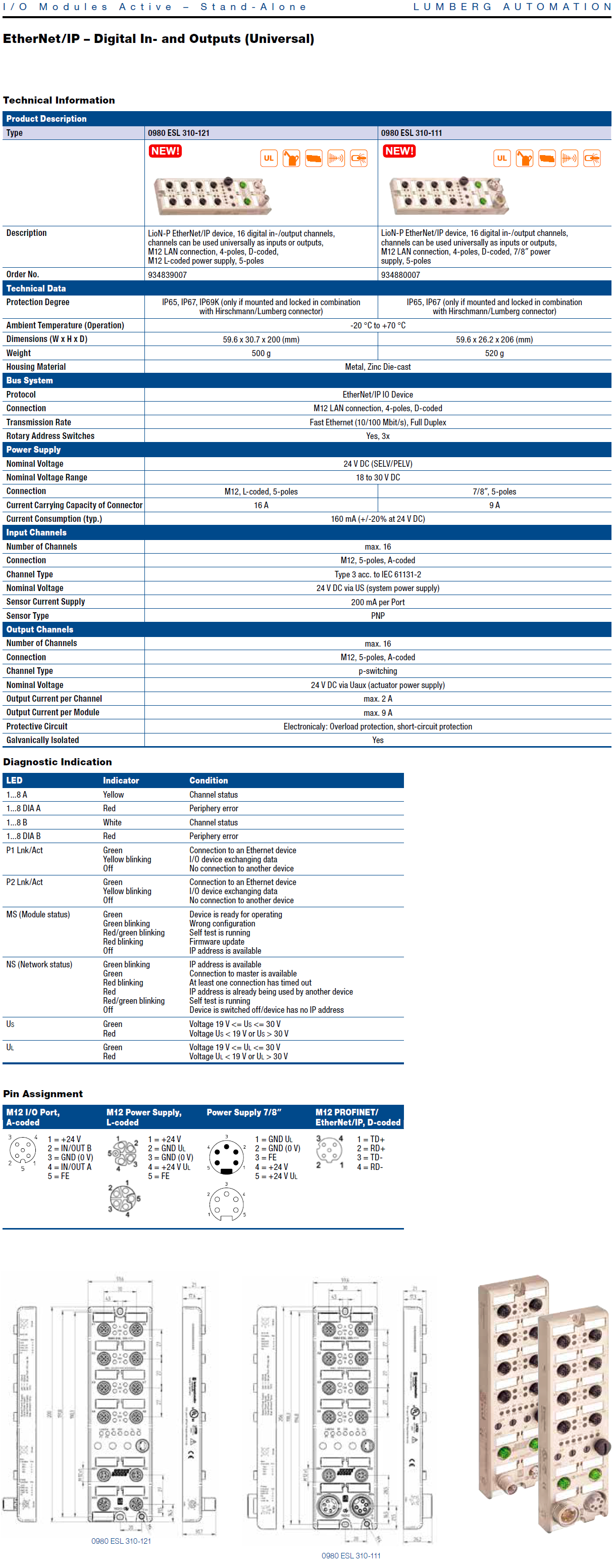 0980 ESL 310-111 – LioN-P, EtherNet/IP I/O Device, 16DIO (8x M12), 7/8″ Power Supply, Metal, 60 mm