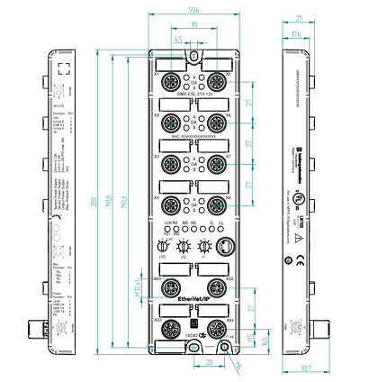 0980 ESL 310-121 – LioN-P, EtherNet/IP I/O Device, 16DIO (8x M12), M12 L-coded Power Supply, Metal, 60 mm