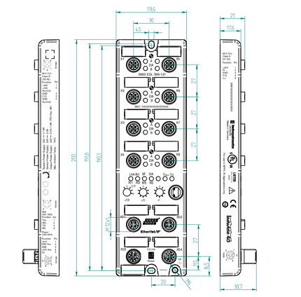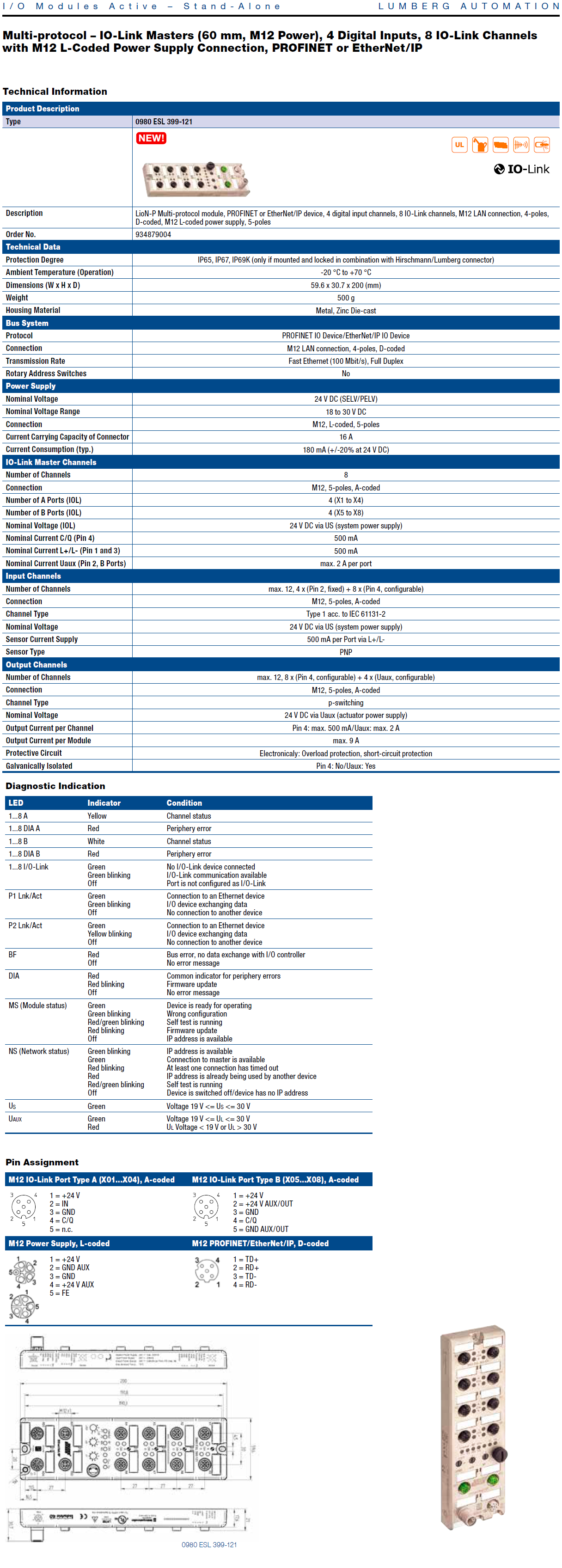 0980 ESL 399-121 – LioN-P, Multiprotocol IO-Link Master, 4DI 4DO 8IOL (8x M12), M12 L-coded Power Supply, Metal, 60 mm
