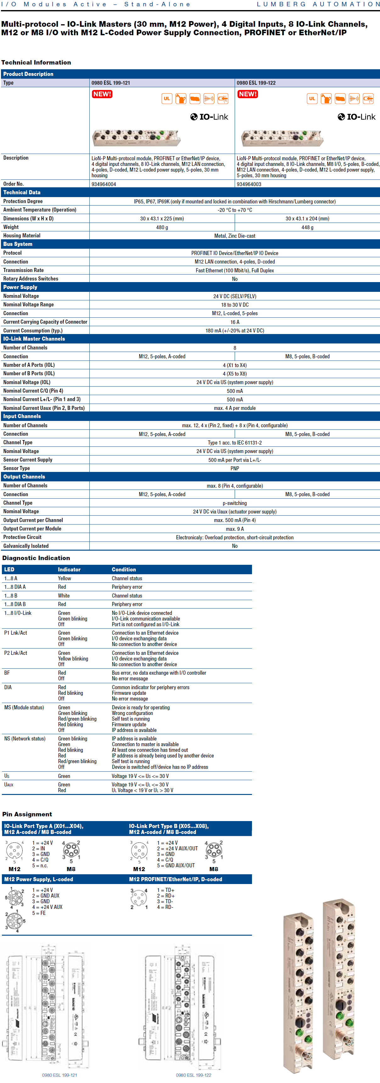 0980 ESL 199-121 – LioN-P, Multiprotocol IO-Link Master, 4DI 8IOL (8x M12), M12 L-coded Power Supply, Metal, 30 mm