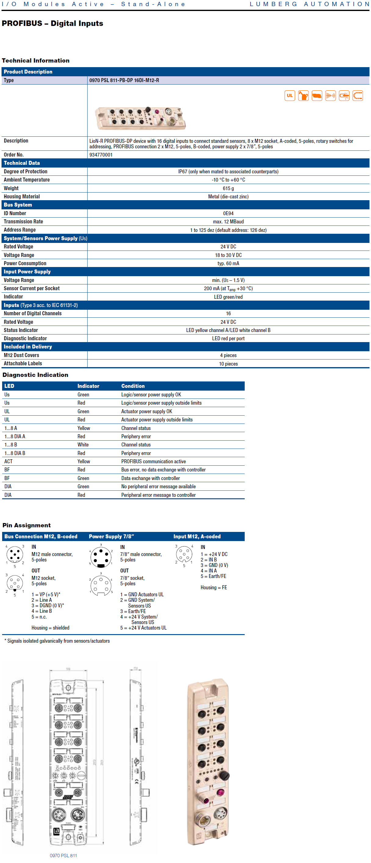 0970 PSL 811-PB-DP 16DI-M12-R, LioN-R PROFIBUS-DP module with 16 digital inputs for connecting standard sensors, 8 x M12 sockets, A-coded, 5 poles, rotary switch for setting addresses, PROFIBUS connection, 2 x M12, 5 poles, B-coded, 2 x 7/8“ power supply, 5 poles
