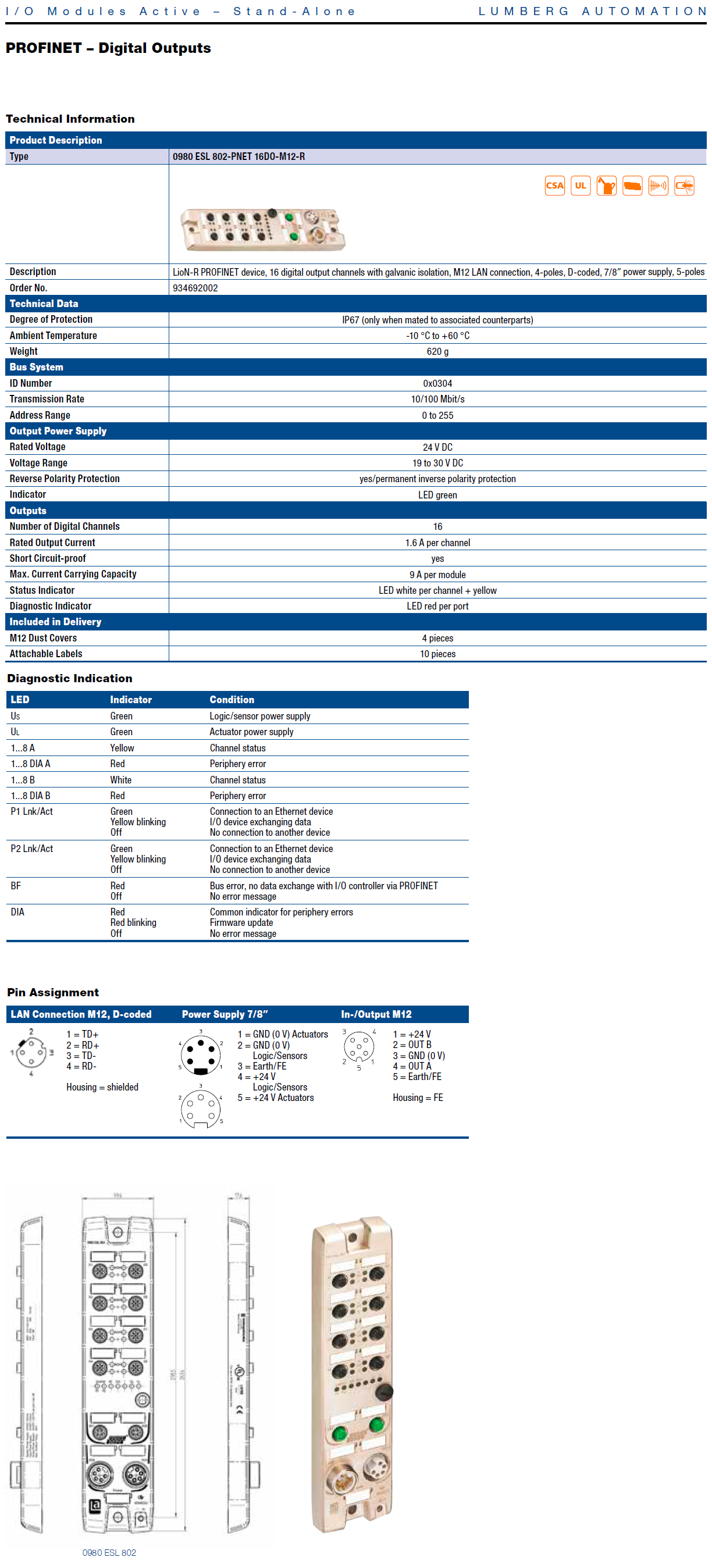0980 ESL 802-PNET 16DO-M12-R – LioN-R, PROFINET I/O Device, 16DO (8x M12), 7/8″ Power Supply, Metal, 60 mm