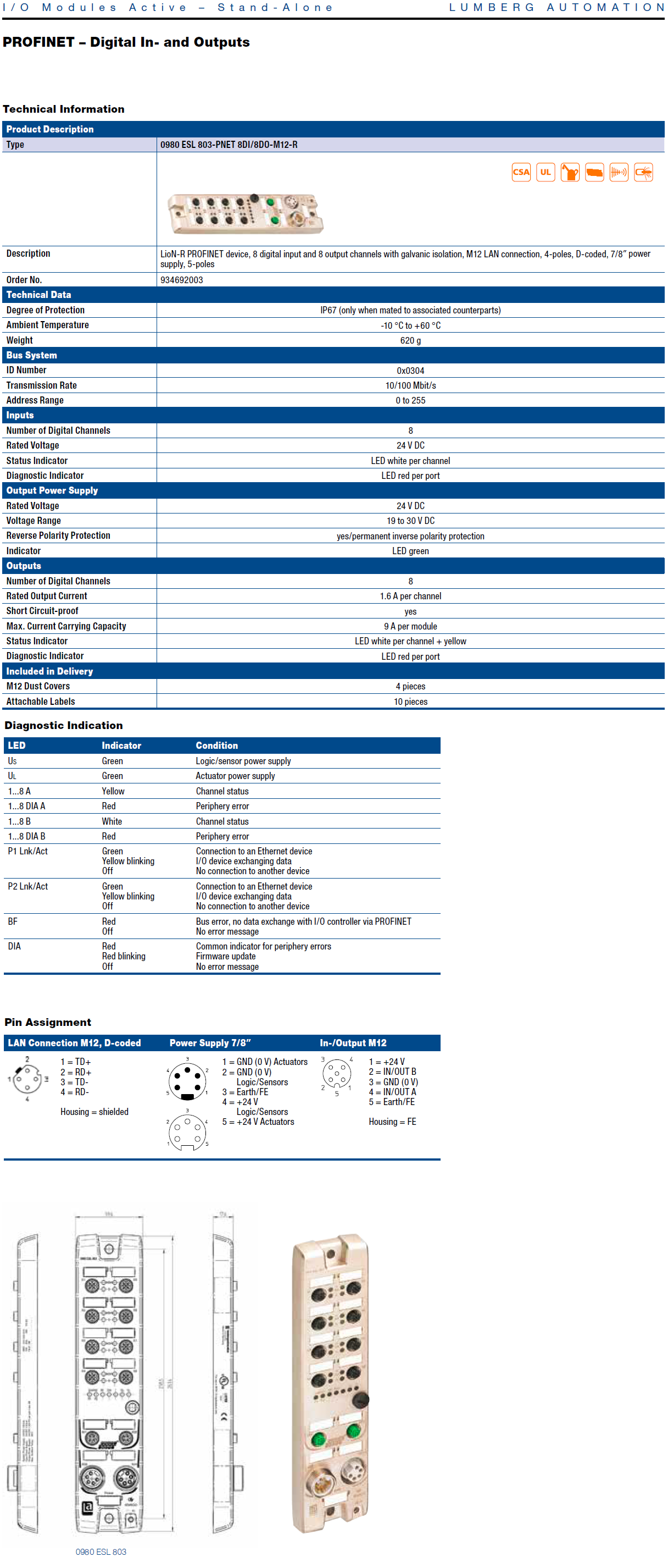 0980 ESL 803-PNET 8DI/8DO-M12-R – LioN-R, PROFINET I/O Device, 8DI 8DO (8x M12), 7/8″ Power Supply, Metal, 60 mm