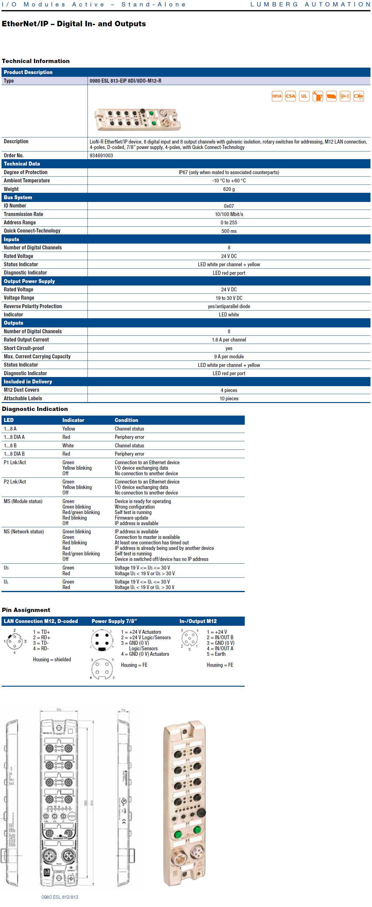 0980 ESL 813-EIP 8DI/8DO-M12-R – LioN-R, EtherNet/IP I/O Device, 8DI 8DO (8x M12), 7/8″ Power Supply, Metal, 60 mm