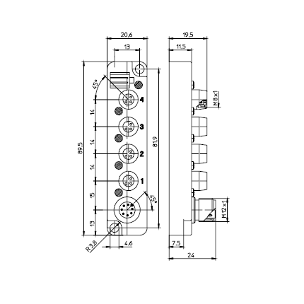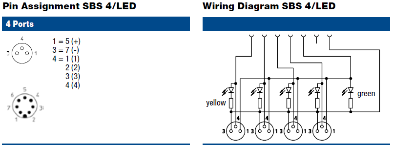 SBS 4/LED 3 – Pluggable miniature actuator/sensor distribution box with LED operation and function indicators, top-entry, 4-ports, M8 socket, 3-poles, 1 signal per socket, M12 connection for the control cable. Control cable type: RKT 8-6-337 or RKWT 8-6-337. Plastic, 20,6 mm