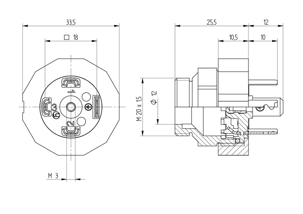 GSP 2 M20 GSP DIN standard receptacle with connection thread and solder contacts: Form A, 3-pin (2+1PE), M20, black housing, solder type; 400 V AC/DC, 16 A