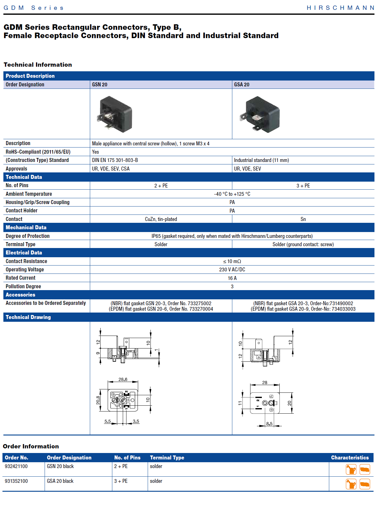GSA 20 GSA Industrial Standard Receptacle: Form B, 3-pin (2+1PE), UL 1977, black contact bearer, solder type (PE screw type); 230 V AC/DC, 16 A