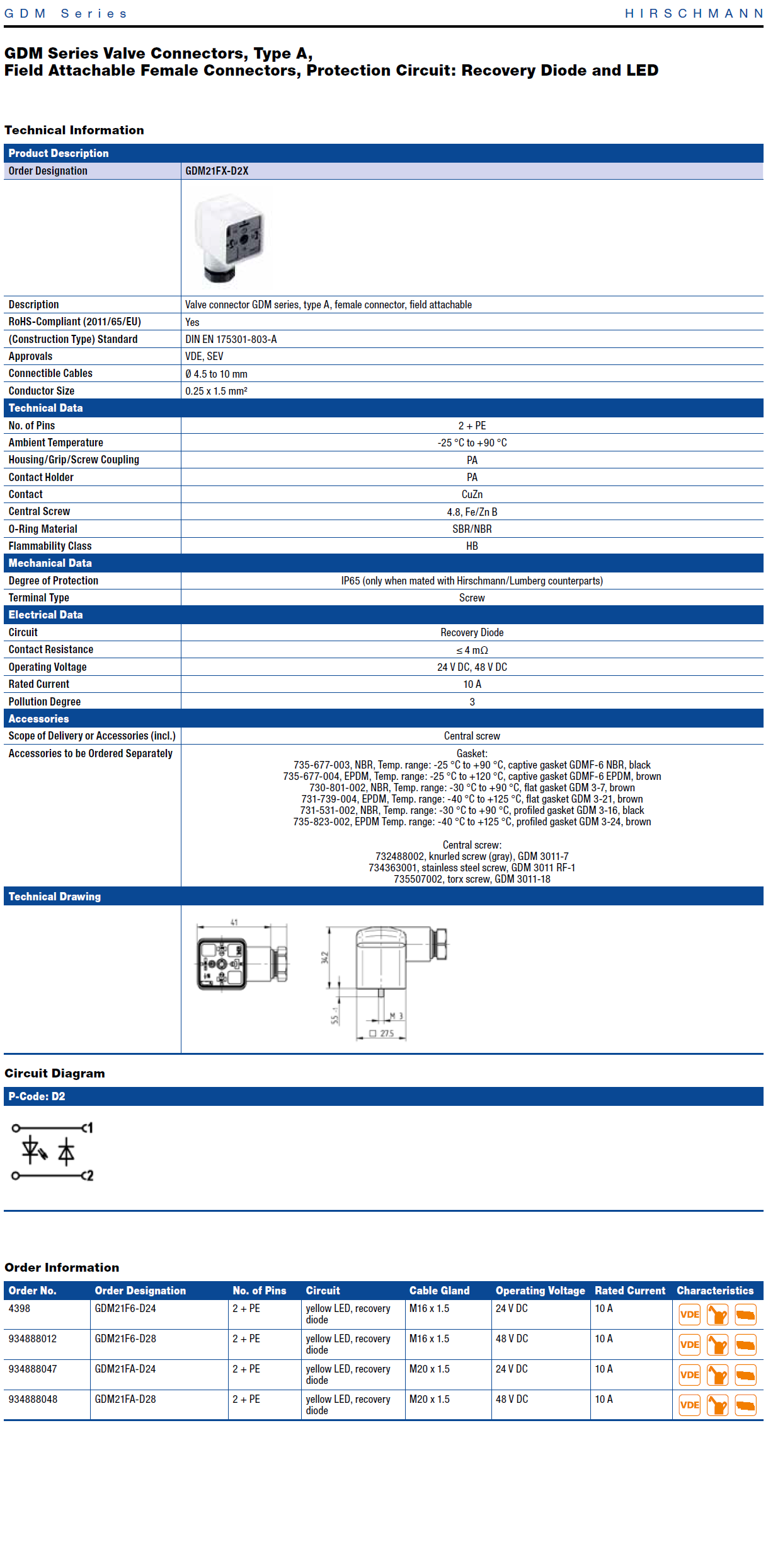GDM21F6-D28-10D GDM Standard DIN Standard Field Attachable Connector: Form A, 3-pin (2+1PE; PE across cable outlet), transparent housing, screw type, M16; with recovery diode and yellow LED, 48 V DC, 10 A