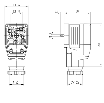 GDME 2011 Timer: Rectangular connector, type A, female connector, field attachable with central screw M3 x 40, strain relief and transparent cover, electronic insert can be installed