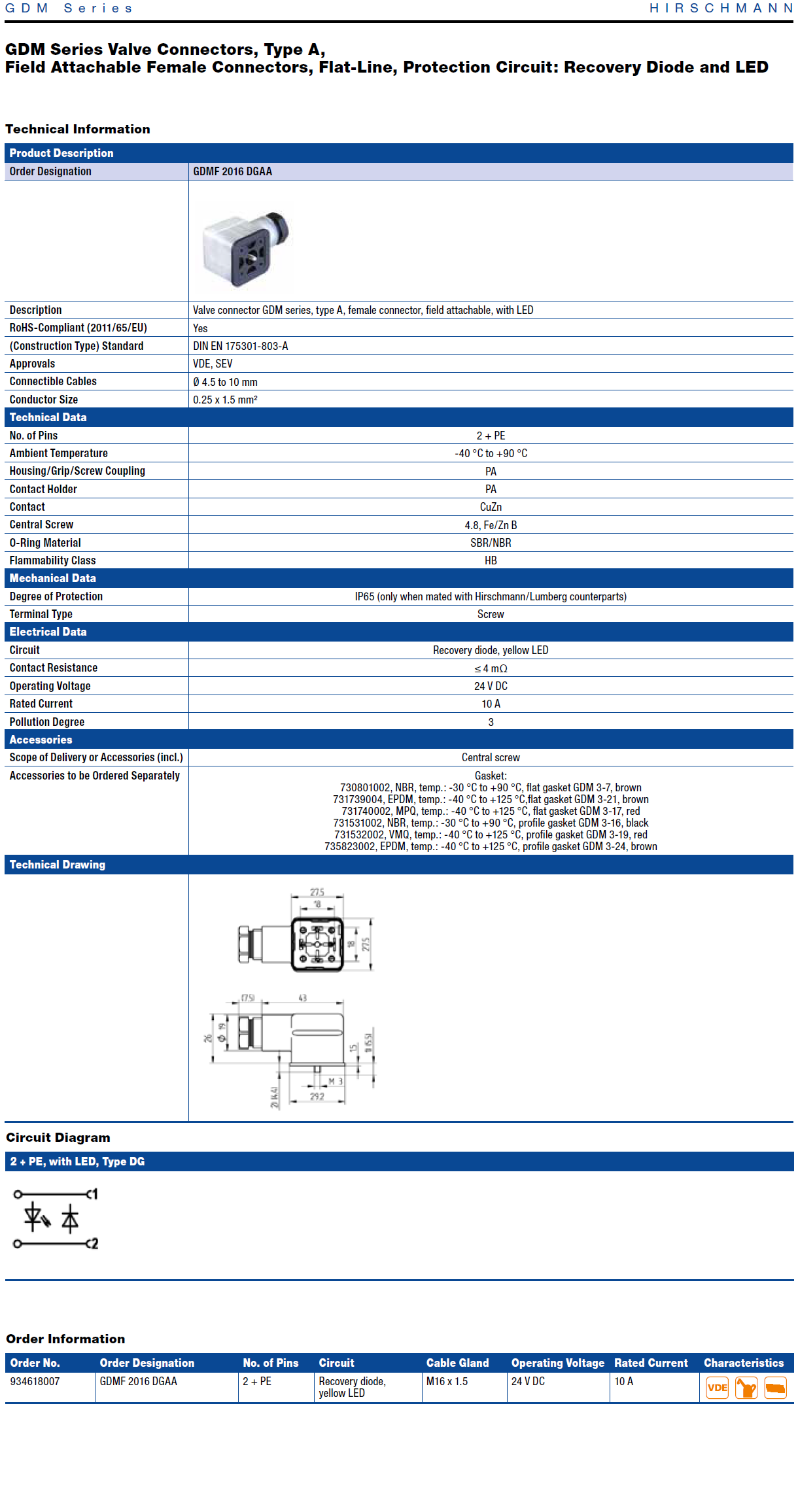 GDMF 2016 DGAA GDMF Flat Line DIN Standard Field Attachable Connector: Form A, 3-pin (2+1PE; PE across cable outlet), transparent housing, screw type, M16; with recovery diode and yellow LED, 24 V DC, 10 A