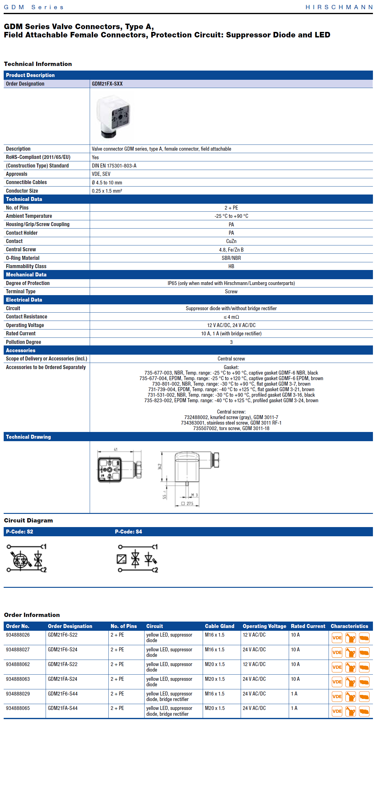 GDM21FJ-S24-10D GDM Standard DIN Standard Field Attachable Connector: Form A, 3-pin (2+1PE; PE across cable outlet), transparent housing, screw type, M16 with strain relief; with supressor diode and yellow LED, 24 V AC/DC, 10 A
