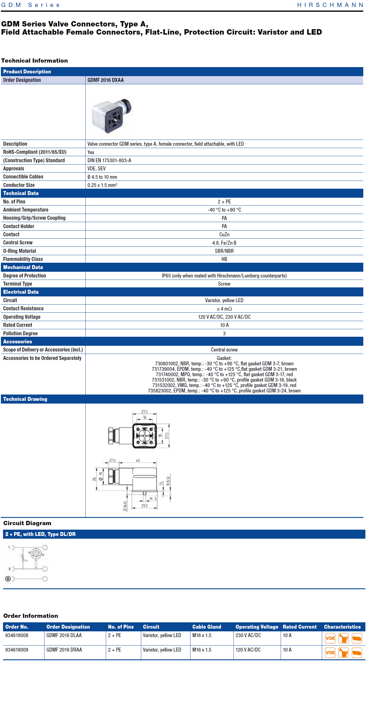 GDMF 2016 DRAA GDMF Flat Line DIN Standard Field Attachable Connector: Form A, 3-pin (2+1PE; PE across cable outlet), transparent housing, screw type, M16; with varistor and yellow LED, 110 V AC/DC, 10 A