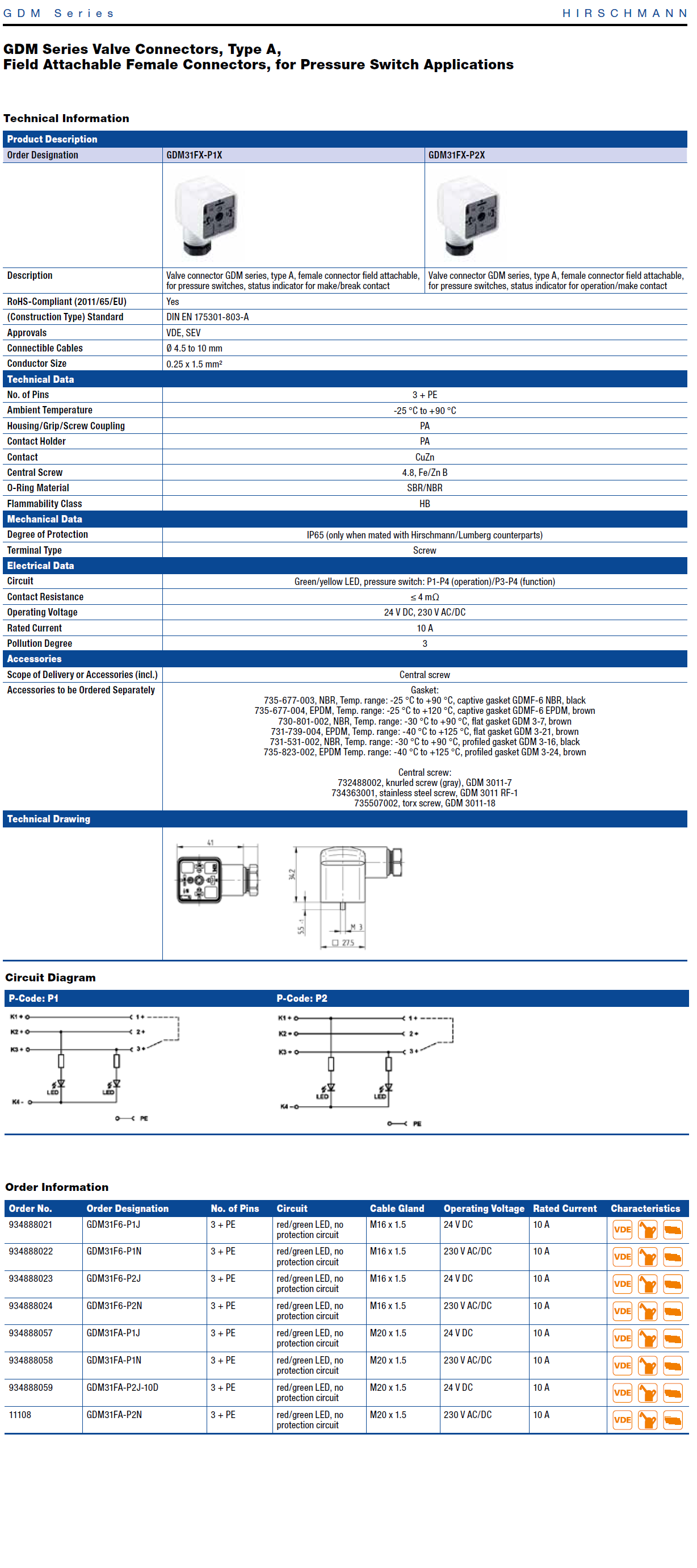 GDM31F6-P1N-10D GDM Standard DIN Standard Field Attachable Connector: Form A, 4-pin (3+1PE; PE across cable outlet), transparent housing, screw type, M16; with red-green LEDs for pressure switch, 230 V AC/DC, 10 A