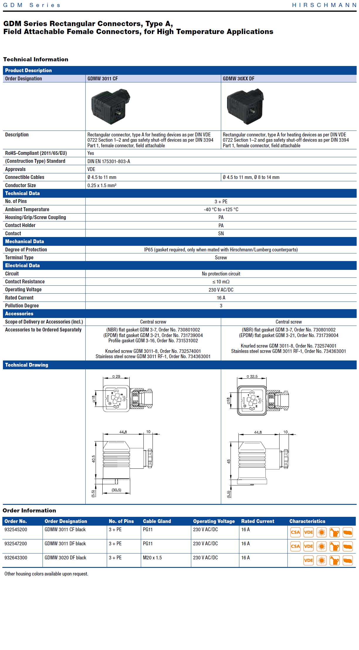 GDMW 30XX DF: Rectangular connector, type A for heating devices as per DIN VDE 0722 Section 1–2 and gas safety shut-off devices as per DIN 3394