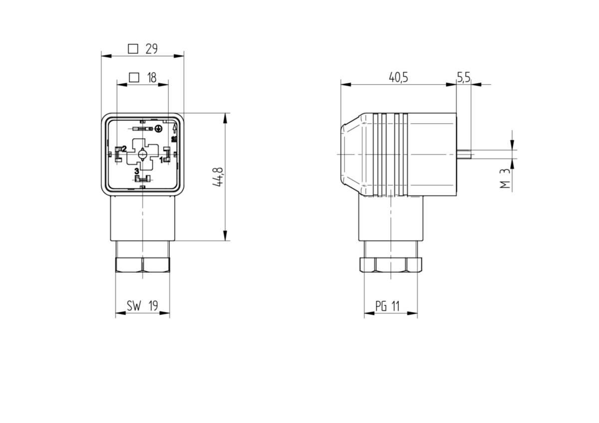 GDMW 3011 CF: Rectangular connector, type A for heating devices as per DIN VDE 0722 Section 1–2 and gas safety shut-off devices as per DIN 3394 Part 1, female connector, field attachable