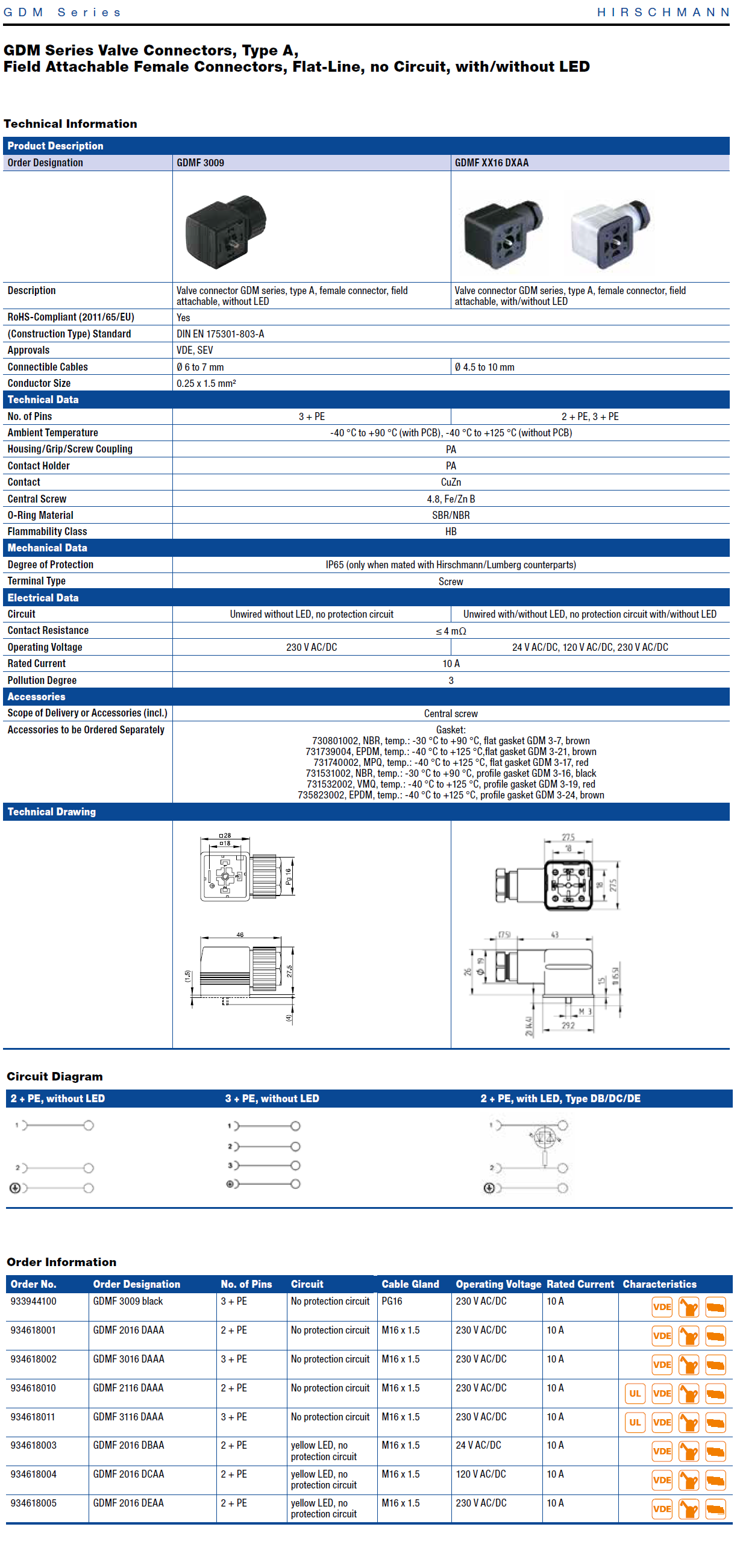 GDMF XX16 DXAA: 2 + PE, 3 + PE Unwired with/without LED, no protection circuit with/without LED